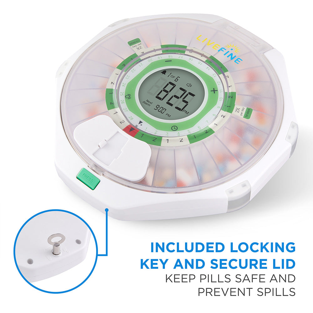 Whether you’re managing prescription medications, dietary supplements, daily vitamins, or other oral treatments, this Automatic Pill Dispenser from LiveFine remembers everything—so you don’t have to. Featuring 9 unique dosage templates, the easy-fill carousel allows you to organize, secure, track, and dispense pills for up to 28 straight days with a maximum of 9 reminders per day. Loading is easy, with a quick-press latch designed for greater accessibility for seniors, those suffering with arthritis or stiffness, amputees, and more. A jumbo LCD screen with 4 lighted windows enables effortless monitoring and programming with info ready at a glance, including current time, upcoming alerts, battery life, and more. You can even adjust alert tone and volume for a truly customized dispensing experience. Once the lights illuminate and alarm sounds, patients simply slide the window and invert the box to dispense current dose. Discover all the healthy benefits of this complete medication management system—add a LiveFine Automatic Pill Dispenser to your cart today!