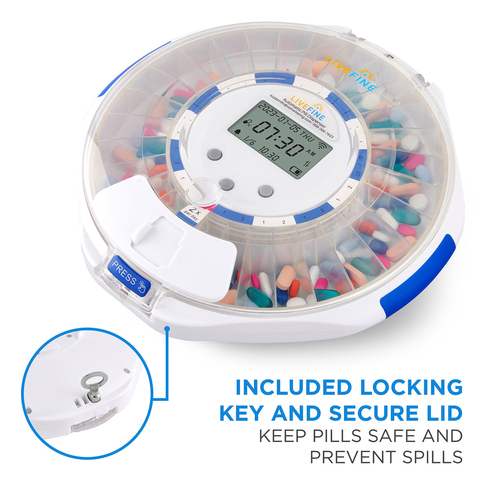 Whether you’re managing prescription medications, dietary supplements, daily vitamins, or other oral treatments, LiveFine takes the guesswork out of your routine with the ultimate efficiency and reliability system. This WiFi-enabled Smart Dispenser makes tracking, taking, and managing your meds easy with an ultra-convenient remote monitoring option to help your family members and caregivers check on your progress straight from their phones. Plus, with 9 unique dosage templates, the easy-fill carousel allows you to organize, secure, track, and dispense pills for up to 28 straight days with a maximum of 9 reminders per day. Then, when the cycle is over, the dispenser automatically resets to the start of the cycle. A jumbo LCD screen provides first-glance updates on the current time, upcoming alerts, battery life, and more.